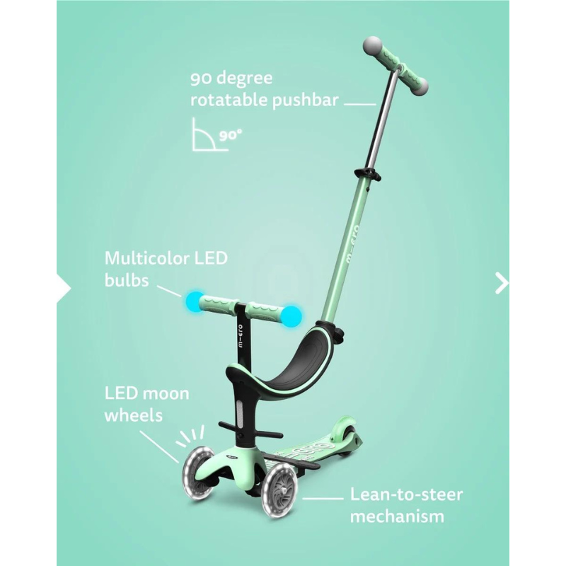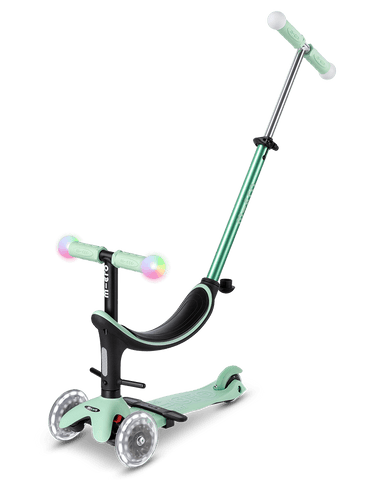 All-in-one deluxe scooter for the first years of life Micro Mini2Grow Deluxe Magic LED Mint The Micro Mini2Grow Deluxe Magic LED is the perfect com...